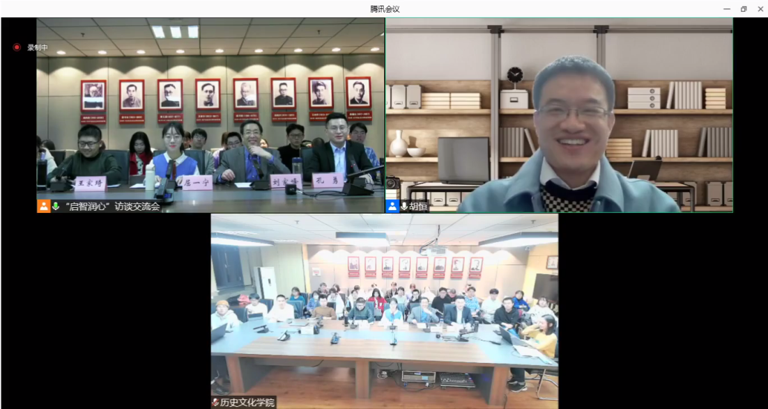 12月1日,历史文化学院举办第一期“启智润心:与青年学者在一起”访谈交流会。本期访谈嘉宾是中国人民大学清史研究所副所长胡恒,历史文化学院副院长刘家峰,青年教师武绍卫、许存健、谢振华参加会议,王家琦、屈一宁、马钰琪、杜世达、高硕五位同学担任访谈人。交流会由青年教师、2020级“强基计划”班主任孔勇主持,学院2020级和2021级“强基计划”全体同学通过线上线下形式参会。